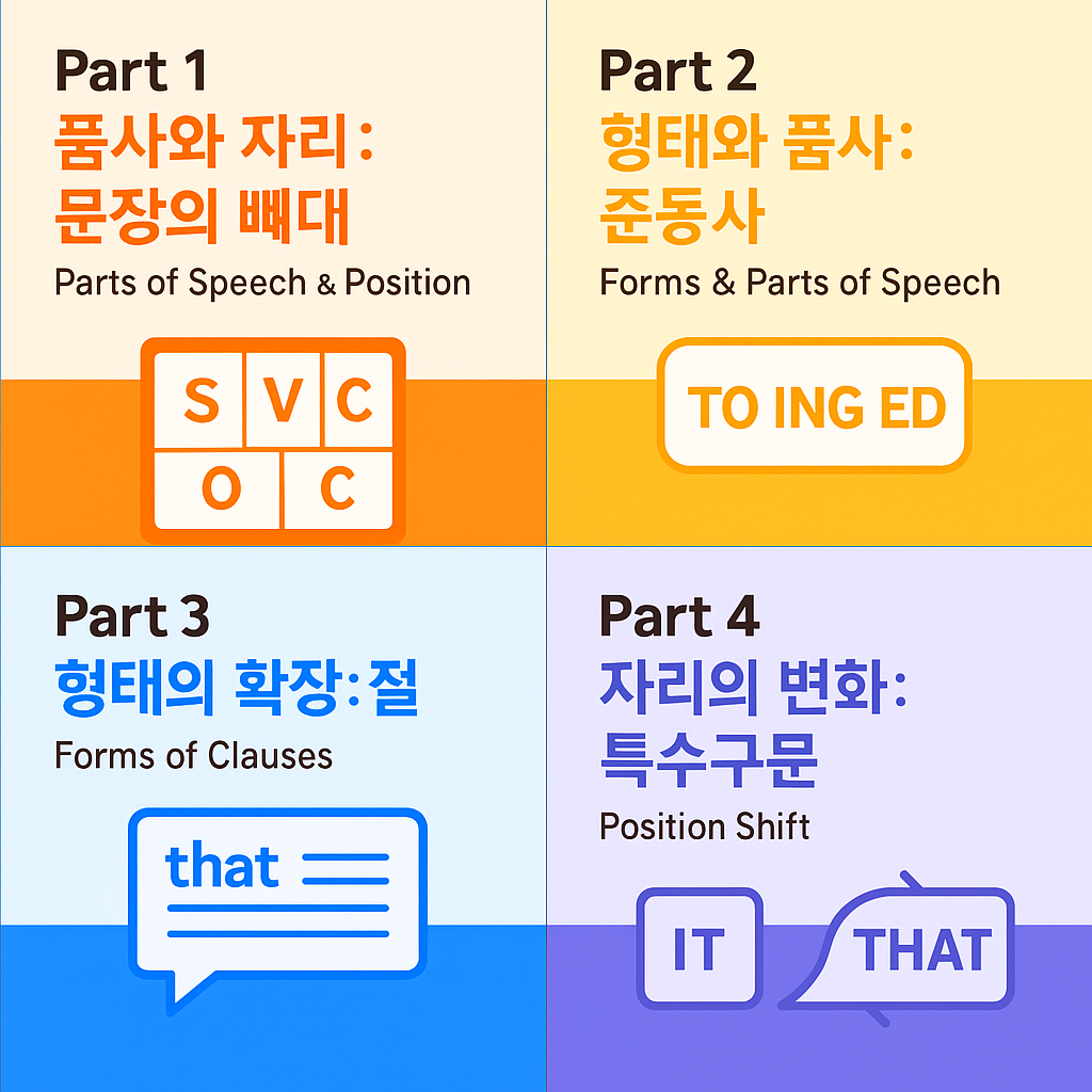 문장의 겉모양이 아닌, 뼈대와 구조를 중심으로 품사 → 자리 → 준동사 → 절 → 구조 변화까지 탄탄하게 연결되는 4파트 시리즈로 구성되어 있습니다.
